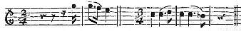 <29> §. 6. Der Allabreve ist eine Abkürzung des geraden Tactes. er hat nur zween Theile, und ist nichts anders, als der in zween Theile gebrachte Vierviertheiltact: daß folglich zwey Viertheile auf eins zu stehen kommen. das Zeichen des Allabreve ist der durchgestrichene C Buchstabe. Man pflegt in diesem Tacte nur wenige Auszierungen anzubringen [Fußnote]