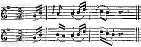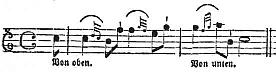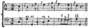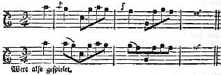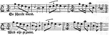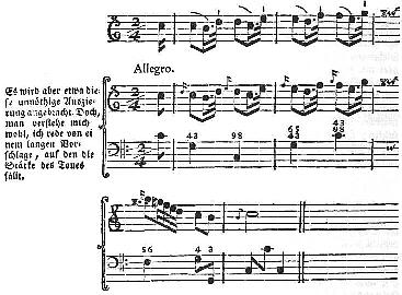 §. 10. Die aufsteigenden Vorschläge sind überhaupts nicht so natürlich, als die absteigenden; sonderheitlich die, welche aus den nächsten, und zwar aus einem ganzen Tone herfliessen: weil sie meistens Dissonanten sind. Wer weis aber nicht, daß die Dissonanten nicht aufwärts, sondern abwärts müssen gelöset werden? [Fußnote: ...] Man handelt demnach sehr vernünftig, wenn man einige Zwischennötchen dazu spielt, die durch die richtige Auflösung der Dissonanten das Gehör vergnügen, und sowohl die Melodie als die Harmonie bessern. Z.E.