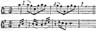 §. 11. Man pflegt auch den aufsteigend Vorschlag mit zwo Noten von der Terze zu machen und an die Hauptnote anzuschleifen, wenn auch gleich dem Ansehen nach der Vorschlag aus dem Nebentone herfliessen sollte. Diesen Vorschlag mit zwoen Noten heißt man den Schleifer. Z.E.