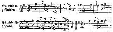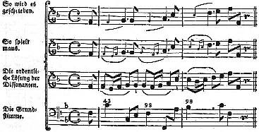 Hier können iene ungeschickte Spieler, die alle Noten verkräuseln wollen, die Ursache einsehen, warum ein vernünftiger Componist sich ereifert, wenn man ihm die schon ausgesetzten Noten nicht platt wegspielet. In dem gegenwärtigen Beyspiele sind die absteigenden Vorschläge schon niedergeschrieben und in den Tact eingetheilet. Sie sind Dissonanten die sich schön und ordentlich auflösen [...]. Wer greift es nun nicht mit Händen, daß es sehr elend läßt, wenn man das natürliche mit noch einem langen Vorschlage verderbet? wenn man den Dissonanten, der vorher schon regelmässig vorbereitet ist, ausläßt, und eine andere ungereimte Note dafür ergreift? ja wenn man die Stärke des Tones auf den unnöthig dazu kommenden Vorschlag wirft, den dissonanten aber sammt der Auflösung erst still daran schleifet; da doch der Dissonant stark klingen, und sich bey der Auflösung nach und nach erst verlieren solle? [...]
