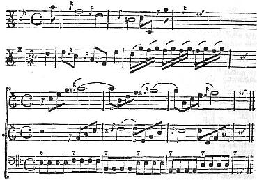 Bey diesen Septbindungen sollte man zwar allezeit erst bey der Achttheilnote (*) von dem Vorschlage in die Hauptnote einfallen [...], allein wenn eine zwote Stimme dabey ist, gefällt es mir gar nicht. Denn, erstlich, fällt die Septime erst mit der Grundnote ein, und hat ihre rechte Vorbereitung nicht; obwohl etwa einer sagen möchte: das Gehör werde durch das Semitonium <202> des Vorschlags betrogen, und durch diesen Aufenthalt, als eine zierliche Suspension, dennoch schon vergnüget. Zweytens fallen die Töne im ersten halben Theile des Tactes so widrig zusammen, daß, wenn wenn es nicht recht geschwind weggespielet wird, die Dissonanze dem Gehör unerträglich ist. [...]