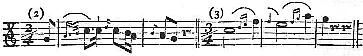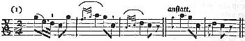 §. 4. Die zwote Art der langen Vorschläge, die man die längern Vorschläge nennen mag, findet man erstlich bey punctierten Noten; zweytens, bey halben Noten, wenn sie im 3/4-Tacte gleich Anfangs stehen, oder wenn im Zweyviertheil oder Vierviertheiltacte nur eine oder höchstens zwo vorkommen, davon eine mit dem langen Vorschlage bemerket ist. In diesen Fällen wird der Vorschlag länger gehalten. Bey punctierten Noten hält man den Vorschlag so lang, als die Zeit der Note austrägt; anstatt des Puncts hingegen <197> nimmt man erst den Ton der Note, doch so, als wenn ein Punct dabey stünde: denn man erhebt den Bogen, und spielt die letzte Note so spät, daß durch eine geschwinde Abänderung des Strichs die darauf kommende Note gleich daran gehöret wird. Z.E.