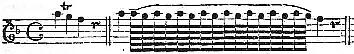 §. 9. Man muß sich vor allem üben einen langen Triller mit Zurückhaltung des Striches zu machen. Denn manchmal muß man eine lange Note aushalten die mit einem Triller bezeichnet ist: und es würde eben so ungereimt lassen dabey abzusetzen, und den [Geigen-]Bogen zu ändern; als wenn ein Sänger mitten in einer langen Note Athem holen wollte. [Fußnote ...] Es ist auch nichts abgeschmackters, als wenn bey einer Cadenze, wo man an das Zeitmaaß nicht gebunden ist, der Triller so schnell und unerwartet abgebrochen wird, daß die Ohren der Zuhörer <225> mehr beleidiget als belustiget werden. Es wird in solchem Falle dem Gehör etwas entrissen; und man bleibt eben deswegen unvergnügt, weil man noch eine längere Aushaltung erwartet hat: gleichwie es den Zuhörern gewiß ungemein hart fällt, wenn sie den Mangel des Athems an einem Sänger bemerken. Doch ist auch nichts lächerlicheres, als ein über die Maase langer Triller. Man gehe demnach den mittlern Weg, und mache einen solchen Triller, welcher dem guten Geschmacke am nächsten kömmt.