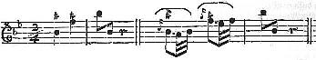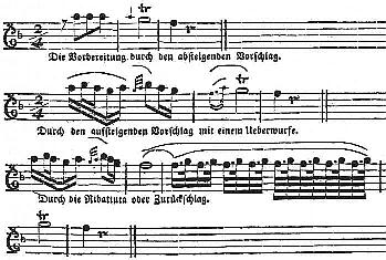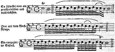 Man kann ihn aber auch durch einen absteigenden Vorschlag, den man etwas länger aushält, oder durch einen aufsteigenden Vorschlag mit einem Ueberwurfe, oder durch eine solche zurückschlagende Bewegung vorbereiten, die man Ribattuta nennet, und welche man bey dem Schlusse einerCadenz anzubringen pfleget, wo man sich an das Zeitmaaß nimmer binden darf.