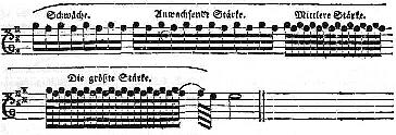 §. 7. Der Triller läßt sich der Geschwindigkeit nach in vier Gattungen theilen: nämlich in den langsamen, mittelmäßigen, geschwinden und anwachsenden. Der langsame wird in traurigen und langsamen Stücken gebraucht; der mittelmäßige in Stücken, die zwar ein lustiges, doch anbey ein gemässigtes und artiges Tempo haben; der geschwinde in Stücken die recht lebhaft, voller Geist und Bewegung sind; und endlich braucht man den anwachsenden Triller meistentheils bey den Cadenzen. Diesen letztern pflegt man auch mit piano und forte auszuschmücken; denn er wird am schönsten auf die hier beygefügte Art vorgetragen. <224>