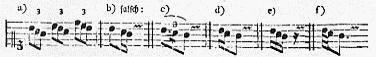 <103> §. 64. Bey Triolen und Tripelnoten wird ebenfalls sehr häufig gefehlt; denn drey gleich lange Noten a), von welchen jede erste einen gelinden Druck, aber keine längere Dauer, erhalten sollte, werden von Vielen so eingetheilt, wie bey b) c) d) e) oder f).