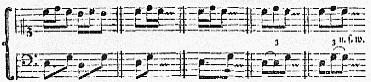 Sollte aber der Schüler solche tellen richtiger eintheilen lernen, so müßte man ihn wohl zuerst jede Stimme einzeln üben lassen, bis er sich eine mechanische Sicherheit in beyden Händer erworden hätte. Alsdann könnte es vielleicht in beyden Stimmen zusammen glücken, besonders wenn man die Bewegung ziemlich geschwind <104> nehmen ließe; denn in diesem Falle ist es schwerer, langsam zu spielen, als geschwind. Außerdem könnte man auch anfangs die in dem nachstehenden Beyspiele klein gedruckten Noten apusiren, und blos die Viertel spielen lassen: