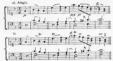 <237> §. 4. Daß die Manieren nicht blos ein Werk der Kunst sind, sondern oft durch die Empfindung selbst an die Hand gegeben werden, hat Sulzer schon angemerkt. Aber freylich wird hierbey ein richtiges Gefühl voraus gesetzt. Demjenigen, welcher z.B. das obige ADAGIO mit den beygefügten Manieren (b) überhäufte, würde man wohl schwerlich ein richtiges Gefühl zugestehen können. - Das Verweilen bey einem wichtigen Tone, der leichte, gleichsam vorbey eilende, Vortrag bey unbedeutenden Intervallen, die jedem Affekte angemessene aber unmöglich immer genau zu bestimmende Modifikation des Tones, und ähnliche Behandlungsarten, können in gewisser Rücksicht gar wohl Manieren genannt werden; sie sind aber blos die Sache eines richtigen Gefühles. Hat der Spieler dieses Gefühl nicht, so ist er zu bedauren; denn er wird durch alle Regeln, die man ihm etwa hierüber geben könnte, nicht dahin gebracht werden, ein Tonstück vollkommen gut und sprechend vorzutragen.