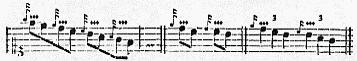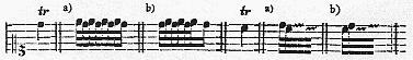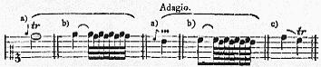 Einige Komponisten pflegen zu der Note mit dem Triller einen unveränderlichen Vorschlag hinzu zu setzen, wie in den folgenden Beyspielen. Dieser Vorschlag ist im Grunde ganz überflüssig, und kann den Spieler zweifelhaft machen. Denn die halbe Dauer der folgenden Note können und sollen ähnliche Vorschläge nicht bekommen, und mit dem Hülfstone würde man die Triller ohnedies anfangen.