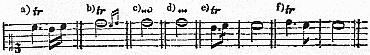 <259> Statt des gewöhnlichen Nachschlages pflegt man oft nur den Ton der folgenden Hauptnote vorzuschreiben, wie bey (e) und (f). In diesem Falle bleibt also der oben erwähnte Nachschlag von zwey Tönen ganz weg.