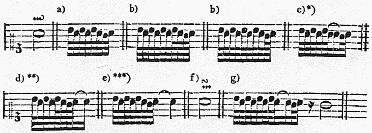 ***) | Marpurg, Anleitung zur Musik überhaupt &c. S. 155. Der Verfasser dieser zuletzt genannten Schrift bezeichnet eben da den Triller mit dem Nachschlage so, wie bey (f), und bestimmt dieser Manier nur die halbe Dauer der Note. Agricola hingegen schreibt (S. 110.) "Der eigentliche oder lange Triller muß die völlige Zeit der Note ausdauern &c." [C.P.E.] Bach behauptet S. 69. eben dasselbe. |