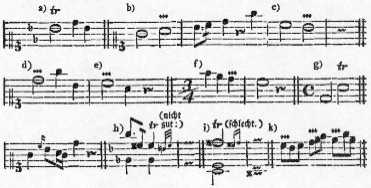 Nur in den Beyspielen (h) und (i) findet der Nachschlag nicht statt, weil dadurch eine Härte entstände. Auch bey Trillern über Triolen und dreygliedrigen Figuren (k) läßt man den Nachschlag weg, weil die erste Note durch diesen Zusatz zu sehr verlängert würde u.s.w.