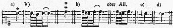 <275> §. 60. Der Mordent (Pincé, Mordant, Kräusel, Beisser [FN: ...]) wird auf zweyerley Art, nämlich kurz und lang gebraucht. Das gewöhnliche Zeichen des kurzen (halben) Mordenten ist dieses: [Mordent-Zeichen]; die Ausführung desselben muß jederzeit (folglich auch bey längern Noten) äußerst geschwind seyn, wie bey (a) und (b).
