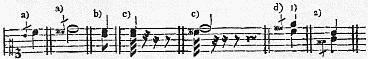 <279> §. 66. Der Zusammenschlag [FN: ...] (Pincé étouffé, ital. acciaccatura) gehört gewissermaßen ebenfalls in die Klasse der Mordenten. Am deutlichsten wird er wohl vermittelst eines kleinen durchgestrichenen Nötchens angedeutet (a). Die von [C.P.E.] Bach &c. gebrauchte Bezeichnung (b) ist etwas unbestimmt, und kann daher leicht einen fehlerhaften Vortrag veranlassen. Bey (c) habe ich die Ausführung, so gut sichs thun läßt, durch beygefügte Pausen bestimmt.