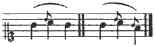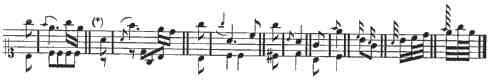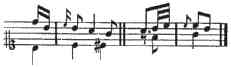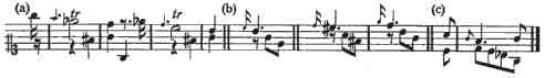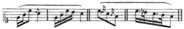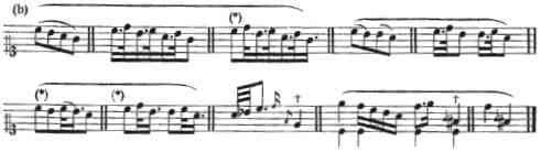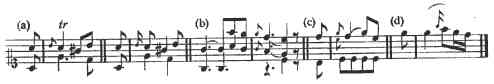 §. 20. Diese Ausschmückung der Vorschläge, indem sie oft neue kleine Nötgen erfordert, ist Ursache zu andern in der Folge erklärten Manieren, und <69> man pflegt also in diesem Falle diese Vorschläge gerne als ordentliche Noten in den Tackt mit einzutheilen (c). Bey langsamen Stücken kan zuweilen der Vorschlag so wohl als die folgende Note ausgeschmückt seyn (d).