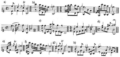 allezeit vor einer etwas langen Note. Man findet sie ferner vor den Schluß=Trillern (a). Vor den halben Cadentzen (b), vor den Einschnitten (c), vor den Fermaten (d), und vor der Schluß=Note nach (e) und ohne vorhergegangenen Triller (f). Wir sehen bey dem Exempel (e), daß nach dem Triller der Vorschlag von unten besser thut, als der von oben, deßwegen würde der Fall bey (g) nicht gut klingen. Langsame punctirte Noten vertragen diese Art von Vorschlägen ebenfals (h). Wenn diese Art von Noten auch schon geschwänzt wären, so muß doch die Zeit=Maaß gemäßiget seyn.
