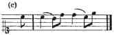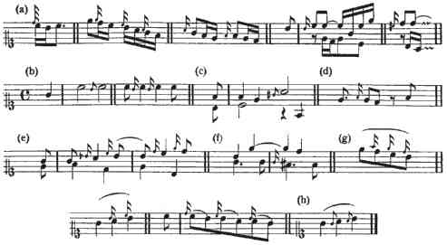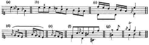 Sie werden ein, zwey, dreymahl oder noch öffter geschwäntzt und so kurtz abgefertiget, daß man kaum merckt, daß die folgende Note an ihrer Geltung etwas verliehret. Dem ohngeacht kommen sie auch vor langen Noten vor, zuweilen wenn ein Ton einige mahl angeschlagen wird (b), auch ausser dem (c). Man findet sie ebenfalls vor Einschnitten bey einer geschwinden Note (d), bey Rückungen (e), Bindungen (f) und bey Schleiffungen (g); Die Natur dieser Noten bleibt dadurch unverletzt. Das Exempel bey (h) mit Vorschlägen von unten thut besser, wenn die Vorschläge als Achttheile gespielt werden. Uebrigens müssen bey allen Exempeln über die kurtzen Vorschläge, diese letztern kurtz bleiben, wenn auch die Exempel langsam gespielt werden.