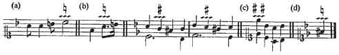 Der letzte Vorschlag dient nicht nur zur Verkürtzung der letzten langen Note, damit sie wegen ihrer Dauer ein Verhältniß mit der vorigen bekomme, sondern er ist <94> auch nöthig wegen der Natur des Doppelschlages, welcher, wie der ihm ähnliche Triller mit dem Nachschlage, sich gerne in die Höhe neiget. Man darf diesen letzten Vorschlag nicht von seiner Note abreissen, (1) weil es ein Vorschlag und kein Nachschlag seyn soll, (2) weil nach der gegebenen Erklärung von den Doppelschlägen, die letzte Note derselben niemahls mit der folgenden sogleich verbunden werden darf, und allezeit ein kleiner Zeit=Raum übrig bleiben muß, damit widrigenfalls kein Triller mit der dritten verwerflichen nachschlagenden Note daraus entstehe; (3) um die proportionirte Geltung der letzten Note beyzubehalten. Wir sehen hier abermahl, was das Abreissen der Vorschläge von ihrer Note für Schaden thun kan. Dieses leichte zu verhüten, macht man den prallenden Doppelschlag nach der Regel so scharf als möglich, damit das c wie ein simples Sechzehntheil zu klingen scheine; hierdurch wird der folgende Vorschlag hinlänglich von dieser Manier abgesondert. Ohngeachtet die abgebildete Ausführung dieser Passagie ziemlich bunt aussieht und noch fürchterlicher scheinen könnte, wenn sie so, wie sie simpel bey dem Adagio oft vorzukommen pflegt, nehmlich mit noch einmahl so geschwinden Noten ausgeschrieben würde; so beruht doch die gantze Kunst der geschickten Ausführung auf die Fertigkeit einen rechten scharfen Prall=Triller zu machen, und die Ausnahme muß alsdenn gantz natürlich und leichte ausfallen. Bey (d) ist das Exempel etwas verändert, es behält aber dennoch dieselbe Ausführung bey den letzten zwey Noten.