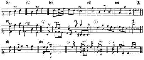 bey gehenden Noten (a), by springenden (b), bey Einschnitten (c), bey Cadentzen (d), bey Fermaten (e), ex abrupto so wohl bey dem Anfange (f) als in der Mitte (g), nach einem Vorschlage am Ende (h), über einer wiederholten Note (i), über der folgenden nach dieser wiederholten, wenn sie nicht aufs neue wiederholt wird, sie mag gehen (k) oder springen (l), ohne Vorschlag, mit solchem, über diesen (m), nach diesem, u.s.w.