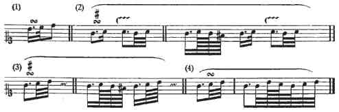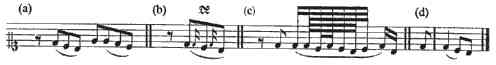 Die mit einem (*) bezeichneten enthalten den eigentlichen Sitz eines Doppelschlages, weil allda keine andere Manier statt hat. Die mit (1) (2) (3) und (4)bezeichneten Figuren, wobey aber die letzte Note allezeit die wiederholte mittelste seyn muß, sind eben so gewiß ein Sitz eines Trillers, als eines Doppelschlags bey geschwindem Tempo. Bey dem Exempel (X) wird zuweilen in langsamer Zeit-Maaß nach dem Doppelschlage noch ein Vorschlag an dieselbe Note gehängt.
