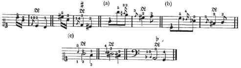 Bey dem Exempel (a) wird durch einen kleinen Ruck mit der Hand nach der lincken Seite nach dem e mit dem zweyten Finger, der dritte aufs folgende d gesetzt, aber nicht über den zweyten geschlagen, wie die verwerflichen Applicaturen lehren. Das Exempel (b) erfordert wegen dieser zusammengesetzten Manier, daß man mit dem dritten Finger von dem halben Tone herunter gleite. Die leichteste Finger=Setzung also bey diesem prallenden Doppelschlage ist die bey (c) abgebildete. Dem ohngeacht thut man dennoch wohl, wenn man ihn fleißig mit allen Fingern übet, weil sie dadurch starck und fertig werden; überdem hängt es nicht allezeit von uns ab, welche Finger wir gerne zu dieser oder jener Manier nehmen.