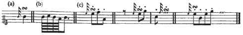 §. 21. Der Doppelschlag allein kommt auch nach einer Note oder Vorschlag vor, und zwar erstlich, wenn solche etwas lang sind Fig. LXI. (a); zweytens, bey einer Bindung (b), und drittens, wenn Punckte nachfolgen, (c).