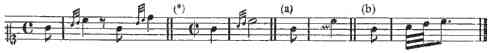 §. 3. Die erstern werden durch zwey kleine Zweyunddreißigtheile angedeutet Tab. VI. Fig. LXXXVIII. Bey dem Allabreve-Tackte können es auch Sechzehntheile seyn (*). Man findet diese Manier bisweilen so bezeichnet wie wir bey (a) sehen. Oft wird sie auch mit ihrer Ausführung ausgeschrieben (b).