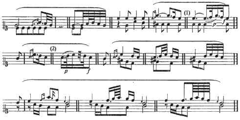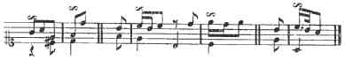 §. 6. Diese Manier, liebt das sehr geschwinde und das sehr langsame, das gleichgültige und das alleraffecktuöseste, und wird also auf zweyerley sehr verschiedene Art gebraucht. (1) Bey geschwinden Sachen zur Ausfüllung und zum Schimmer; hier stellt sie bequem einen Triller von unten ohne Nachschlag vor, wenn die Kürtze der Note zu diesem Triller nicht hinreichen will, und wird allezeit geschwinde gemacht. Die folgenden Noten können gehen oder springen.