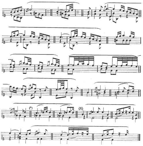 §. 4. Die Schleifer von zweyen Nötgen unterscheiden sich noch von denen mit dreyen Nötgen auf zweyerley Art; (1) kommen jene allezeit vor einem Sprunge vor, allwo sie die Intervallen darzwischen ausfüllen Fig. LXXXVIII, diese hingegen, wie wir bald sehen werden, kommen auch ausser diesen vor; (2) werden jene allezeit geschwinde gespielt (b), diese aber nicht.