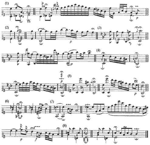§. 4. Die Fermaten über Pausen kommen mehrentheils im Allegro vor, und werden gantz simple vorgetragen. Die andern zwey Arten findet man gemeiniglich in langsamen und affecktuösen Stücken, und müssen verziert werden, oder man fällt in den Fehler der Einfalt. Es können also allenfals bey den übrigen Stellen eines Stückes eher weitläuftigere Manieren gemisset werden als hier.