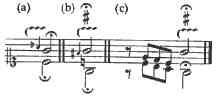§. 6. Wer die Geschicklichkeit nicht hat, weitläuftige Manieren hierbey anzubringen, der kan sich zur Noth dadurch helffen, daß er über einem vorkommenden Vorschlage von oben vor der letzten Note im Discante einen langen Triller von unten anbringet. Findet sich aber in diesem Falle ein Vorschlag von unten, so trägt man ihn simpel vor und macht über der Haupt=Note den erwehnten langen Triller (b). Bey Fermaten ohne Vorschlag hat dieser Triller über der letzten Note im Discante ebenfals statt (c).