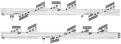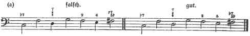 Blos bey chromatischen Gängen leidet diese Vorschrift zuweilen mit guter Wirkung einige Ausnahme. Man muß nicht beständig in einerley Farbe die Harmonie brechen. Ausserdem kann man zuweilen mit beyden Händen aus der Tiefe in die Höhe gehen; man kann dieses auch blos mit der vollen linken Hand thun, indem man die rechte in ihrer Lage läßt. Diese Art des Vortrages ist auf den Flügeln gut, es entstehet daraus eine angenehme Abwechselung eines gekünstelten Forte unb Piano. Wer die Geschicklichkeit besitzet, thut wohl, wenn er nicht beständig gar zu natürliche Harmonien brauchet, sondern das Ohr zuweilen betrüget: wo aber die Kräfte nicht so weit hinreichen, so muß eine verschiedene und gute Ausführung in allerhand Figuren diejenige Harmonie angenehm machen, welche <337> durch einen platten Anschlag desselben einfältig klinget. In der linken Hand können die meisten Dissonanzen ebenfalls verdoppelt werden. Die dadurch entstehende Octaven verträget das Ohr bey dieser starken Harmonie: die Quinten hingegen sind zu vermeiden. Die Quarte, wenn sie bey der Quinte und None ist, und die Nonen überhaupt verdoppelt man nicht.