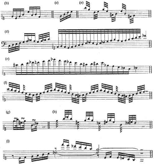 §. 13. Alle Accorde können auf vielerley Art gebrochen, und in geschwinden und langsamen Figuren ausgedrucket werden. Die Brechungen eines Accordes, wobey sowohl dessen Haupt= als auch gewisse Nebenintervallen wiederholet werden (a), sind besonders angenehm, weil sie mehr Veränderungen hervorbringen, als ein simples Harpeggio, wobey man blos die Stimmen so, wie sie in dne Händen liegen, nach und nach anschläget. Bey allen gebrochenen Dreyklängen und Aufgaben, welche sich auf einen Dreyklang zurück führen lassen, kann man aus Zierlichkeit vor jedem Intervalle die grosse (b) oder kleine Untersecunde (c) mit berühren, ohne sie nachher liegen zu lassen. Dieses nennet man: mit Acciaccaturen brechen. Bey den Läufern werden die ledigen Intervallen der Accorde ausgefüllet; mit dieser Ausfüllung kann man eine, und mehrere Octaven, in der gehörigen Modulation herauf und hinunter gehen. Wenn bey solchen Läufern Wiederholungen vorkommen (d), und zugleich fremde Intervallen eingeschaltet werden (e): so entstehen hieraus angenehme Veränderungen. Die Läufer, wobey viele Progreßionen durch halbe Töne vorkommen, erfordern eine mäßige Geschwindigkeit. <338> Es können zuweilen mitten in dem Laufwerk allerhand Aufgaben abwechseln (f). Der Dreyklang mit seinen Verkehrungen kann einerley Läufer haben, und der Septimenaccord mit seinen Verkehrungen ebenfallls. Man vermeidet zuweilen bey den Aufgaben, worin eine überflüßige Secunde stecket, die Progreßion in dieses letztere Intervall (g); in gewissen Figuren kann diese Fortschreitung angehen (h). Gewissen Nachahmungen, sowohl in der geraden als Gegenbewegung, lassen sich sehr gut in verschiedenen Stimmungen anbringen (i). Die im eilften Paragraph angeführten chromatischen Accorde schicken sich am besten zu langsamen Figuren und tiefsinnigen Erfindungen, wie wir aus dem letzten Probestück des ersten Theils dieses Versuchs sehen.